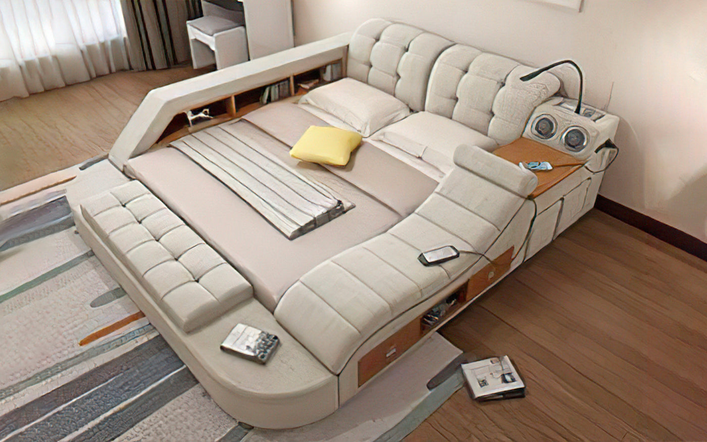 Loaded with features that will make you wonder how you ever slept without them. With a built-in Bluetooth stereo system, you can enjoy your favorite tunes or podcasts without ever leaving your bed. The air purifier ensures that you breathe clean, fresh air throughout the night. The massage chair will help you unwind after a long day, while the USB charger allows you to keep your devices charged and within reach. And with the convenient cup holder, you can enjoy a refreshing beverage without having to leave your cozy cocoon. Upgrade to the smart bed today and transform your bedroom into a haven of comfort and luxury.